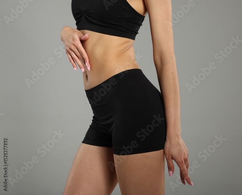 Fototapeta premium Woman with perfect slim body on gray background, closeup