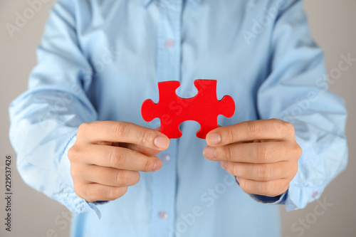 Fototapeta premium Woman with piece of color puzzle, closeup