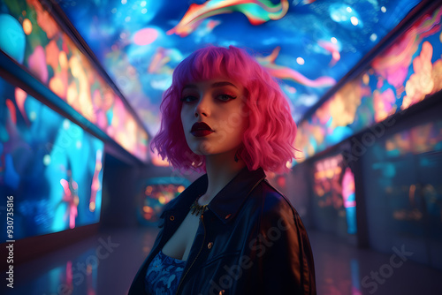 © yusraa_designz, Fototapeta premium woman with pink short hair and a blue jacket is standing in front of a pink neon night club