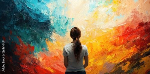 © NpicArt, Obraz premium Woman with ponytail gazes at colorful abstract artwork