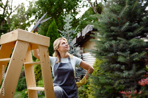 © Nomad_Soul, Naklejka premium Woman with pruners climbs the stairs in garden