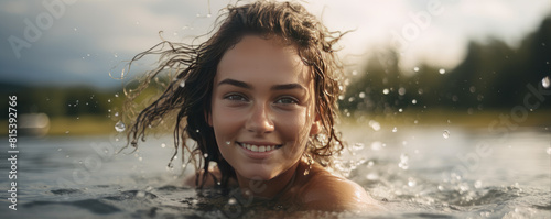 © amazingfotommm, Obraz premium Woman with red hair smiles brightly, surrounded by golden lit flowers, enjoying nature