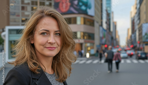 © ArtNeuroNet, Fototapeta premium Woman with shoulder-length blonde hair, light skin, slight smile, wearing black blazer and grey top, standing on bustling city street. Tall buildings, cars, pedestrians in background.