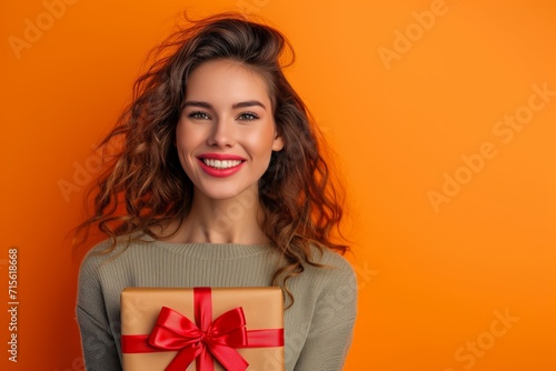 © Anastasiia, Fototapeta premium Woman With The Gift Box On Orange Background