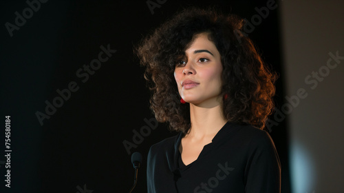 © Iva, Fototapeta premium Woman with thick curly hair stands on the stage as a speaker, ai generative