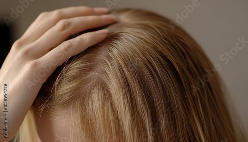© Alex, Naklejka premium Woman with Thinning Hair Holding Hand to Head, Concerned Expression Generative AI