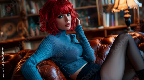 © Synthesia Studio, Obraz premium Woman with vibrant red hair relaxing on a vintage leather couch in a cozy room