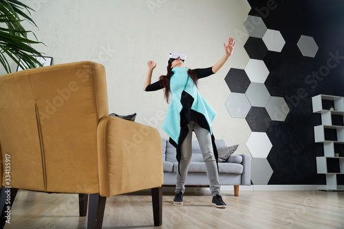 © nuclear_lily, Fototapeta premium Woman with virtual reality headset is playing game.