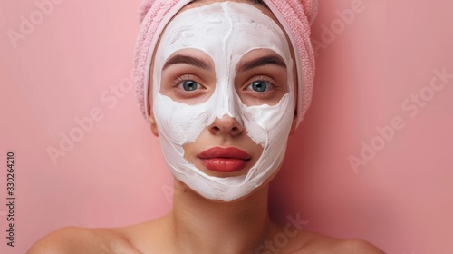 Fototapeta premium Woman with white cosmetic mask, pink towel on her head, red lipstick and blue eyes on a pink background.