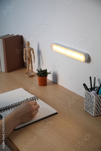 Obraz premium Woman working at desk with LED lamp on wall, closeup
