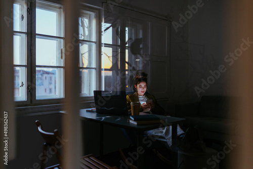 © bernardbodo, Fototapeta premium Woman working at modern office and using phone