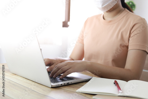 Fototapeta premium Woman working from home. wearing protective mask. COVID-19 Pandemic Coronavirus home isolation auto quarantine wearing face mask protective for spreading of disease virus