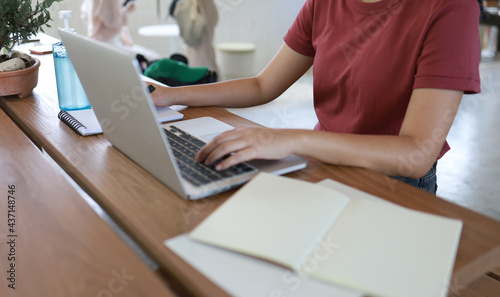Fototapeta premium Woman working in cafe wearing protective mask. coronavirus COVID-19 Social distancing keep distance in public society people to protect COVID
