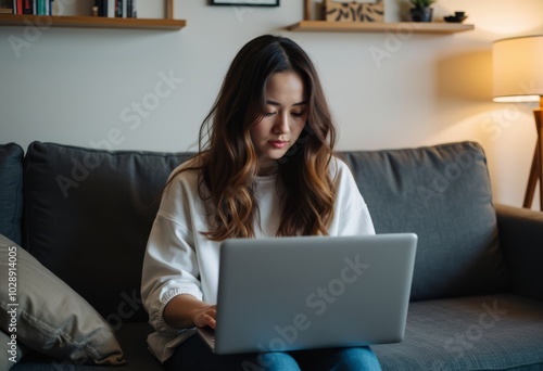 © Hathairat, Fototapeta premium Woman working on a laptop at home, focused and engaged in her task.