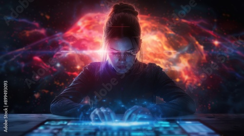 © 1000lnw, Fototapeta premium Woman Working on Futuristic Technology with a Galaxy Background.