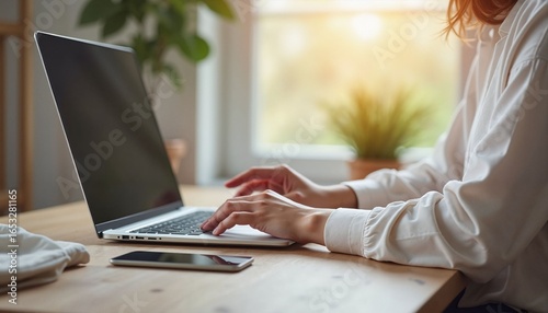 Fototapeta premium Woman working on laptop at home desk with phone and plant nearby