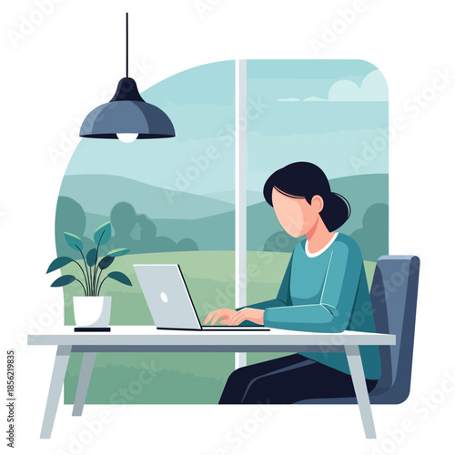 © Mikael, Fototapeta premium Woman working on laptop from home with scenic nature view, home office concept