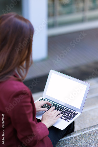 © Phimwilai, Naklejka premium Woman working on laptop outdoors creating content