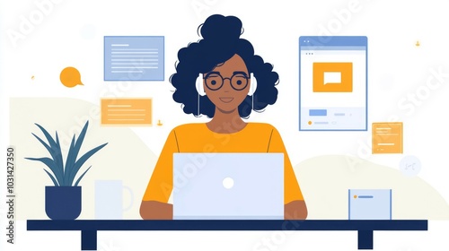 © Andre Jovi, Obraz premium Woman Working on Laptop with Headphones and Notes on a White Background