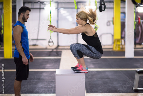 Obraz premium woman working out with personal trainer jumping on fit box
