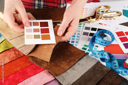 © Africa Studio, Obraz premium Woman working with scraps of colored tissue and palette close up