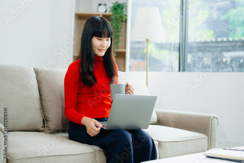 © laddawan, Naklejka premium Woman writing in notebook while using smartphone in cozy living room. Ideal for freelance work, planning, digital lifestyle, and multitasking themes.