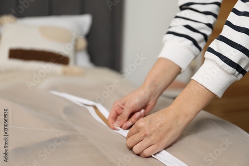 Fototapeta premium Woman zipping garment cover with clothes on bed indoors, closeup