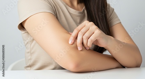 Obraz premium Womans arm on table gently touching her forearm with fingers