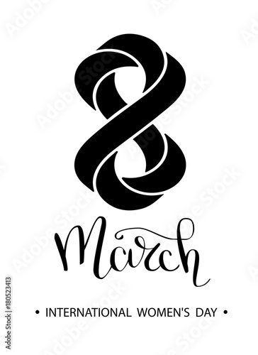 © Ann_Sereda, Naklejka premium Womans day lettering greeting card. Calligraphic pen inscription. An inscription written by hand with a thin pen. Black text on a white background. Vector illustration EPS10.
