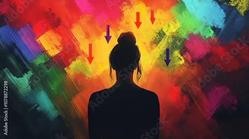 Fototapeta premium "womans_silhouette_with_colorful_thought_bubbles_and_arrows_c":