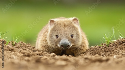 © Kanisorn, Fototapeta premium Wombat digging showcased in vivid portrait photography, striking colors enhancing contrast, ample text space, minimalist design with intriguing depth.