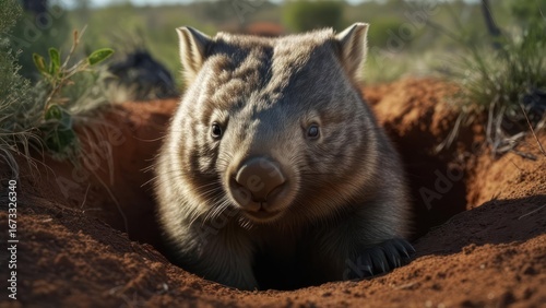 Obraz premium Wombat emerging from burrow