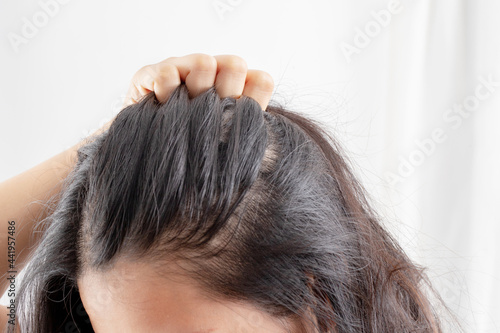 © kamonwan, Naklejka premium Women allergic to shampoo causing hair loss, baldness, dandruff