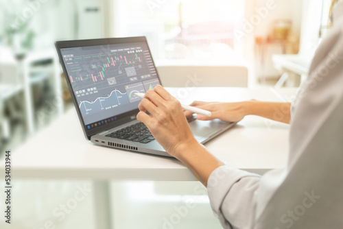 © supakitmod, Fototapeta premium Women analysis of digital market and investment in block chain crypto currency by computer.