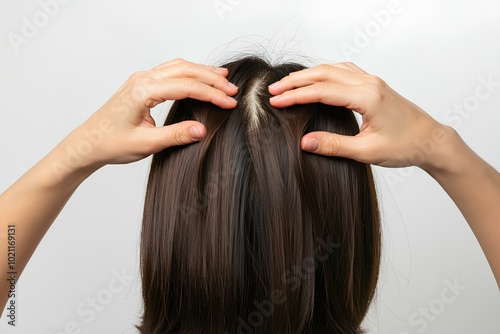 © happy Wu , Naklejka premium 女性。頭皮のクローズアップ。頭頂部。薄毛。白背景|Women. Close-up of scalp. Parietal. Thinning hair. White Background