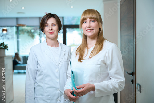 © Viacheslav Yakobchuk, Fototapeta premium Women doctors stand in the hospital lobby at reception desk