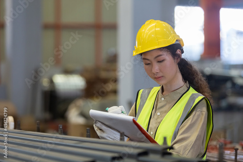 Fototapeta premium women engineer take notes on paperwork quality control standing at machine of factory warehouse.