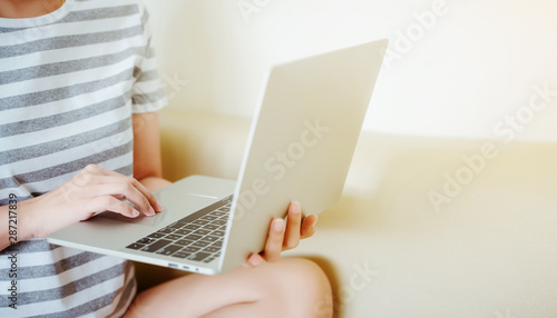 Fototapeta premium Women hands typing on laptop keyboard. Working or shopping online concept.