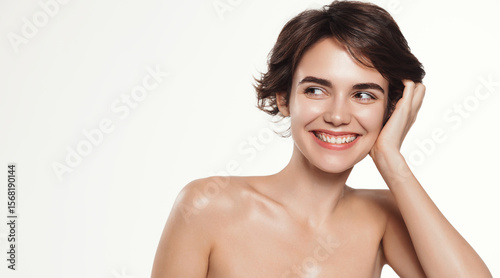 © Liubov Levytska, Obraz premium Women health and wellness. Portrait of smiling, young natural woman with healthy white smile, pixie short hair, looks away at promo sign space, has glowing skin after facial and body treatment