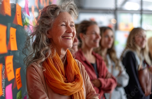 © yevgeniya131988, Obraz premium Women in their thirties and an older woman laughing, brainstorming around a glass board with notes