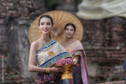 Fototapeta premium women in traditional clothing on historical on background. Portrait women in traditional clothing , Thai traditional in Ayutthaya, Thailand.
