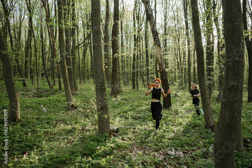 © dsheremeta, Fototapeta premium Women jogging through a sunlit forest trail