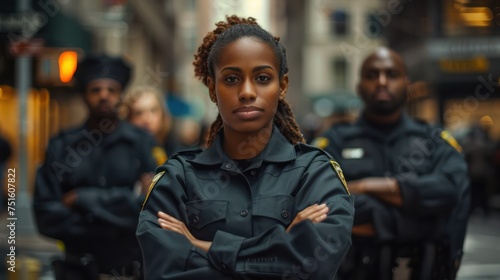 Fototapeta premium Women, men and security guards in the city fold their arms.