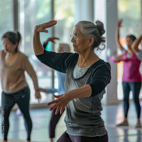 © mindstorm, Obraz premium Women of different ages exercising ballet moves in training room Indian.