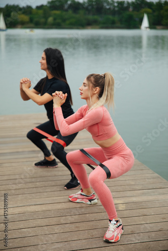 Fototapeta premium Women Practicing Squats by the Lakeside in Activewear During a Fitness...