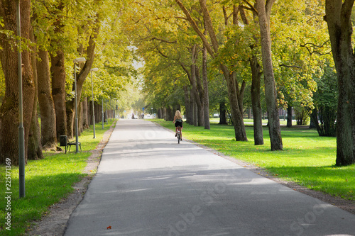 Fototapeta premium Women riding a bike in city park.