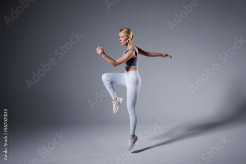 Fototapeta premium Women running and jumping in studio. Female runner on blue gray background. Healthy blonde woman. Profile view of sport runner. Full length of fit girl