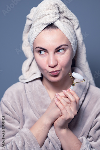 Obraz premium Women's beauty and spa. Beautiful woman using guasha jade stone roller massaging her face for a radiant complexion and healthy skin