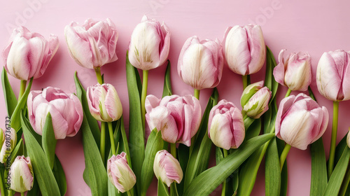© Iryna, Fototapeta premium Women's Day. Tulips on a pink background, free space. mockup.