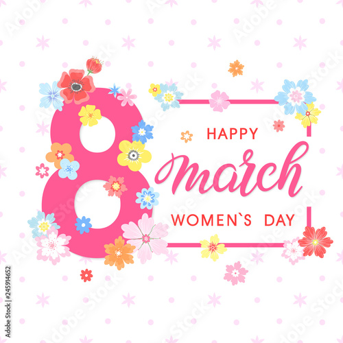 © Xenia Artwork , Fototapeta premium Women`s Day typography - hand painted lettering with different flowers and floral elements.Seasons greetings card perfect for prints,flyers,posters,holiday invitations and more.Vector 8 march card.